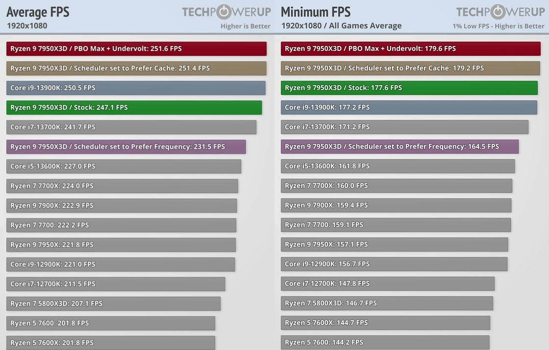 At 1080p, AMD Ryzen 9 7950X3D performed almost the same as Intel Core i9-13900K, both in average FPS and minimum FPS. There was a minor increase in performance when the chiplet with cache was preferred. Here too it was seen that it performed great in some games but badly in some others. However, big improvements were seen when using Ray Tracing in games. Except in Ray Tracing, similar benchmark results were found in 1440p and 4K gaming benchmarks too.